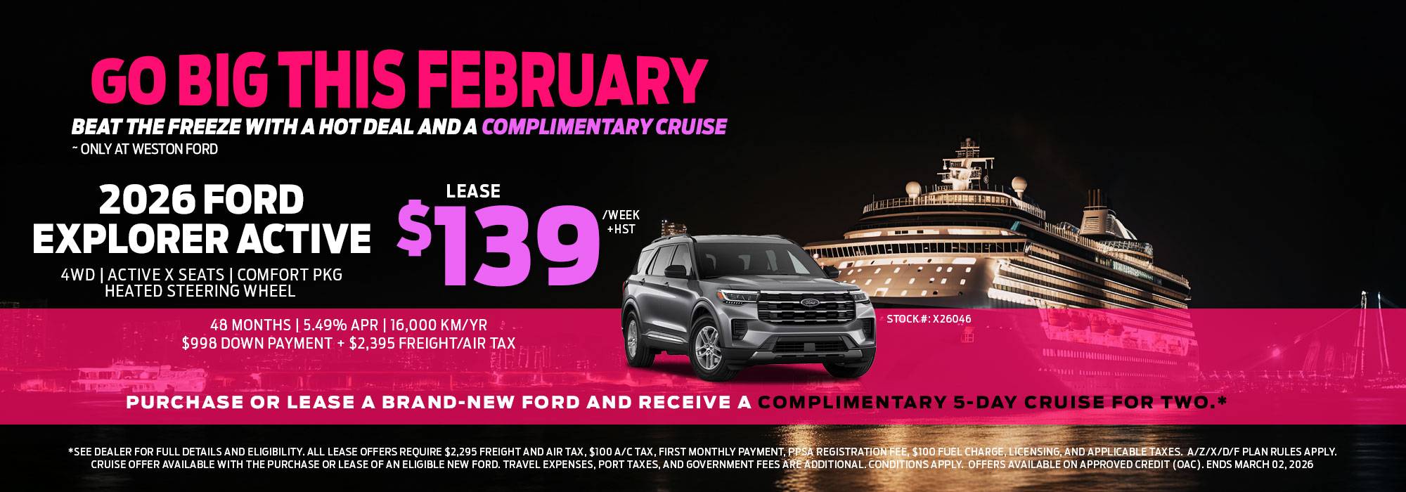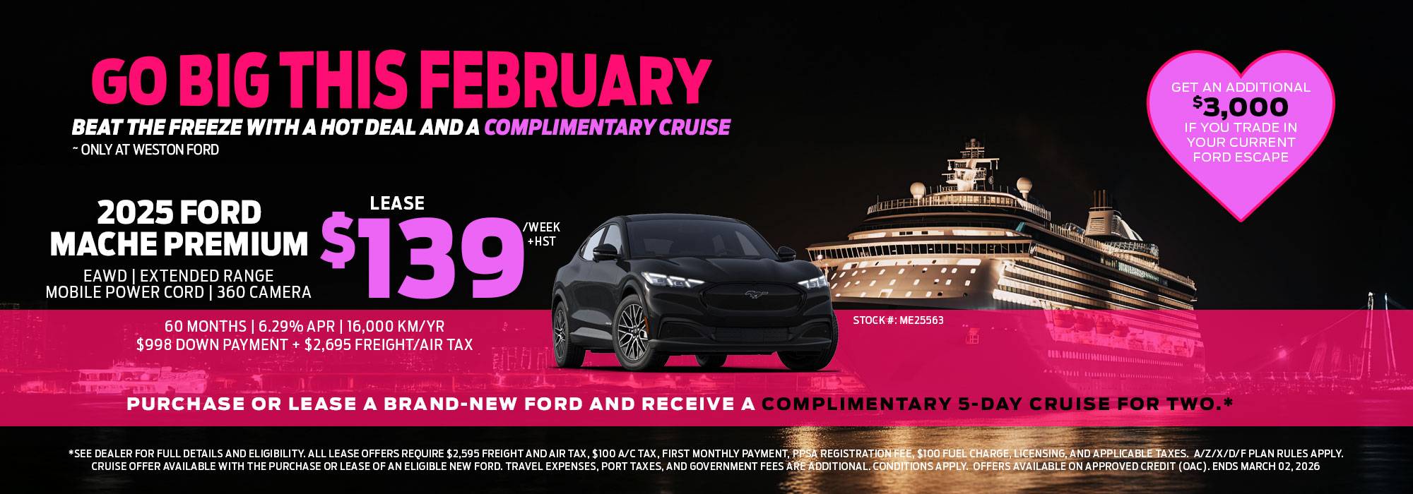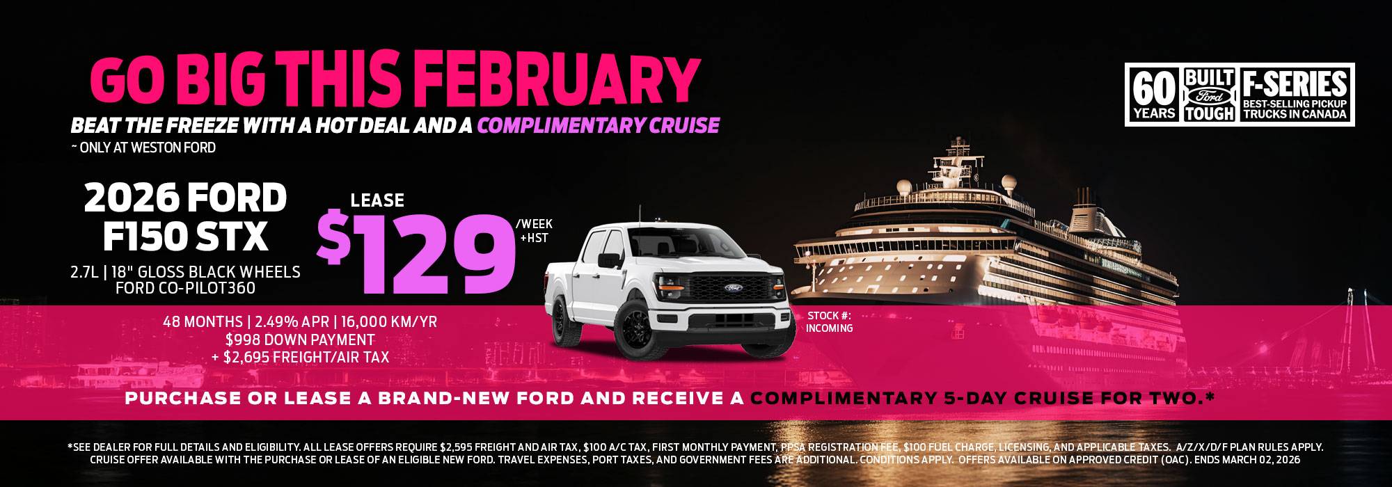 Weston Ford, a dealer in Toronto, Ontario, offers new and used Ford, trucks, SUVs and Crossovers. Search for all new 2025 and 2026 Ford vehicles, including Bronco, Bronco Sport, Edge, Escape, Expedition, Explorer, Ranger, F-150, F-150 Lightning, F-250 Super Duty, F-450 Super Duty to Mustang and Mustang Mach-E.