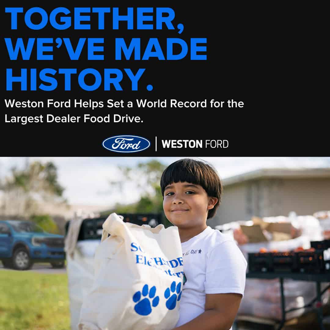 This past September, Weston Ford proudly joined Ford’s Global Food Drive, an international effort uniting dealerships to combat food insecurity and support families in need. The initial goal was ambitious — to collect 1 million pounds of food around the world — but the results were beyond anything anyone expected.